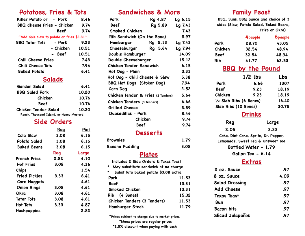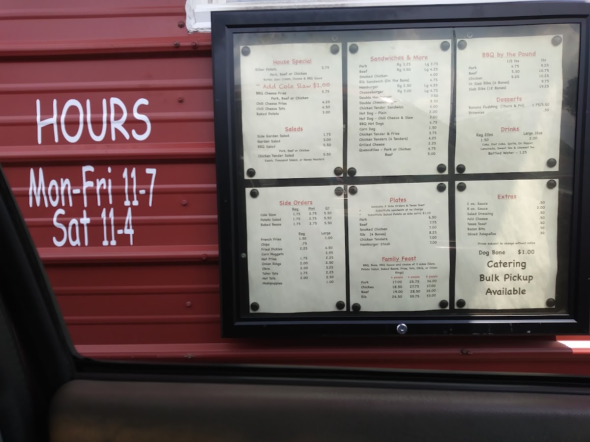 Highlights like the pulled pork sandwich, Killer Potato loaded with butter, cheese, and BBQ sauce, and chili cheese fries provide a glimpse into the down-to-earth flavors that shape the experience here. From generous portions of ribs by the pound to baked potatoes and hushpuppies, the offerings fit perfectly with a cozy spot where good food meets no-fuss enjoyment.